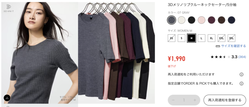 UNIQLO:3Dメリノリブクルーネックセーター/5分袖 カラー: 07 GRAY