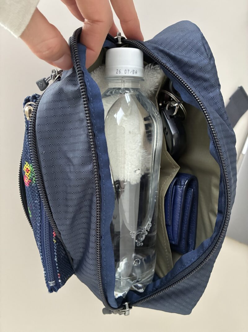 私が普段持ち歩いているものに加えて、ペットボトルを入れてもこんな感じ